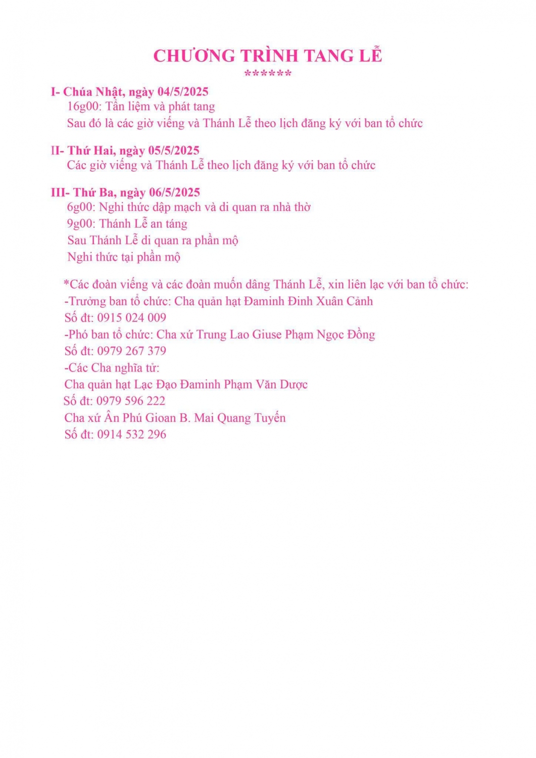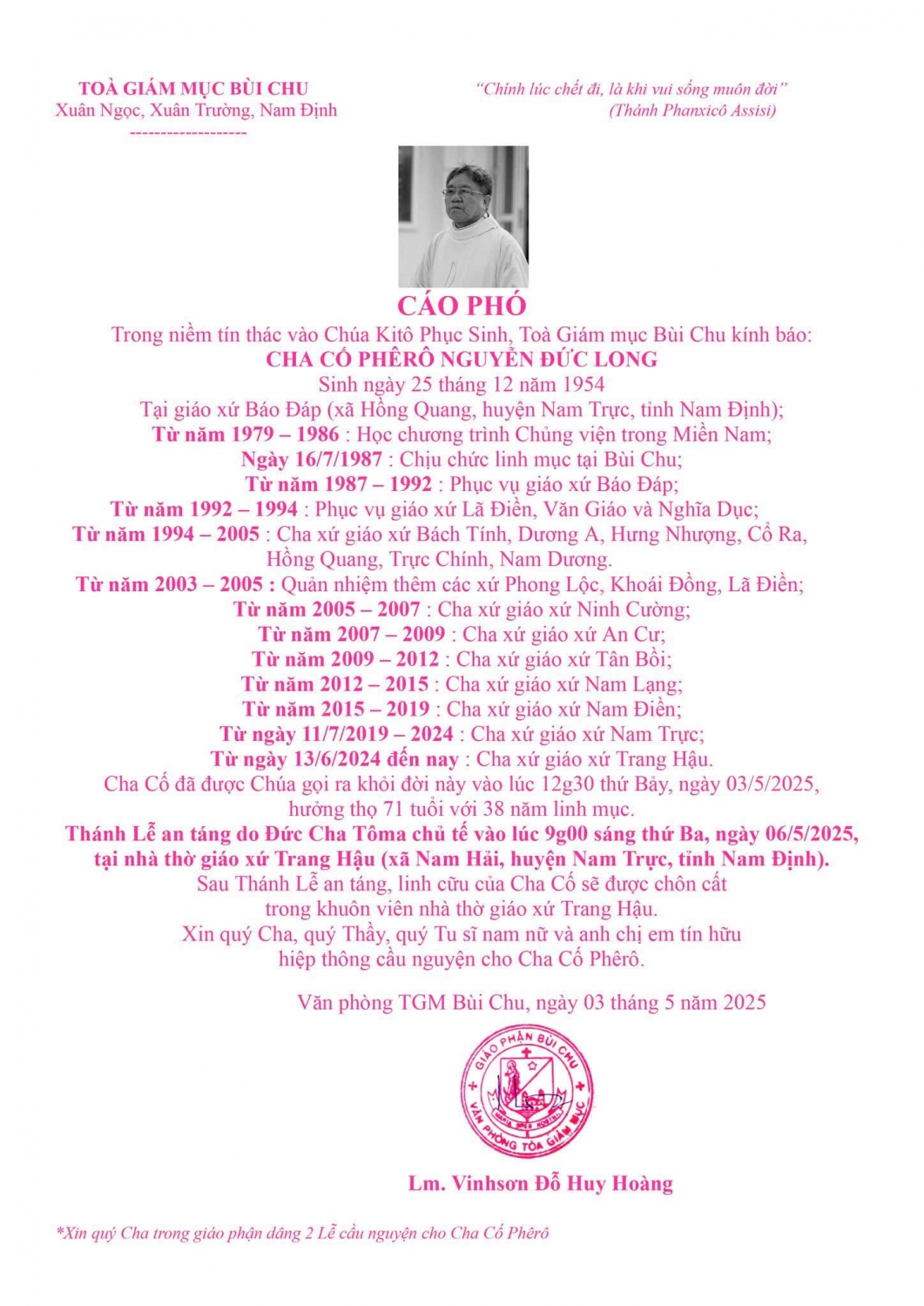 Trong niềm tín thác vào Chúa Kitô Phục Sinh, Toà Giám mục Bùi Chu kính Báo: CHA CỐ PHÊRÔ NGUYỄN ĐỨC LONG sinh ngày 25 tháng 12 năm 1954 Tại Giáo xứ Báo Đáp (xã Hồng Quang, huyện Nam Trực, tỉnh Nam Định) Đã được Chúa gọi về vào lúc 12g30 thứ bảy, ngày 03 tháng 5 năm 2025.