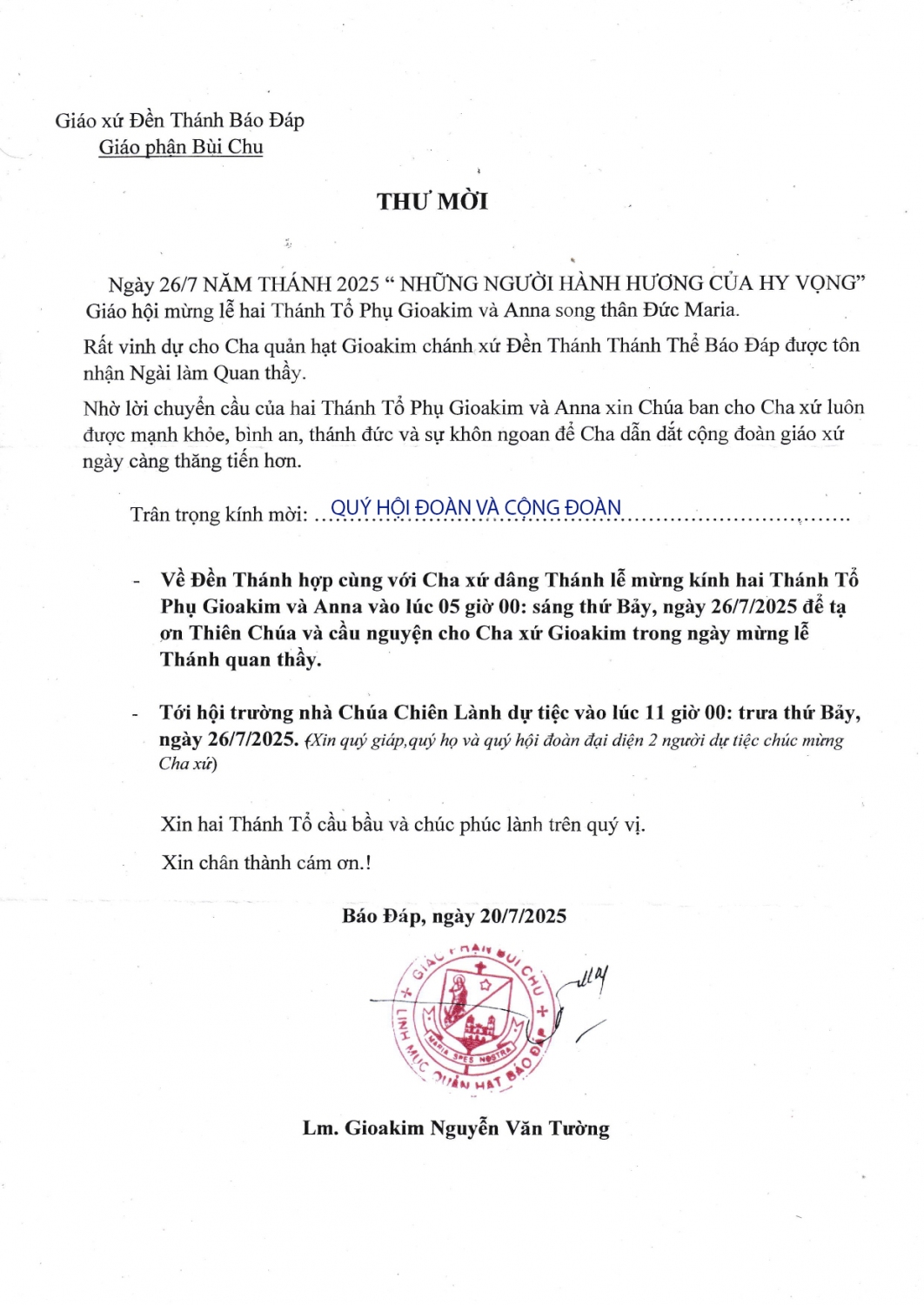 Chương trình lễ Thánh Gioakim & Anna - Quan Thầy cha Chánh xứ 2025