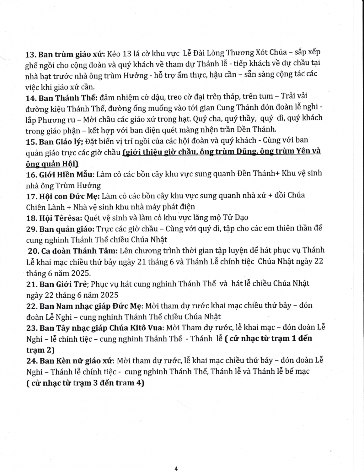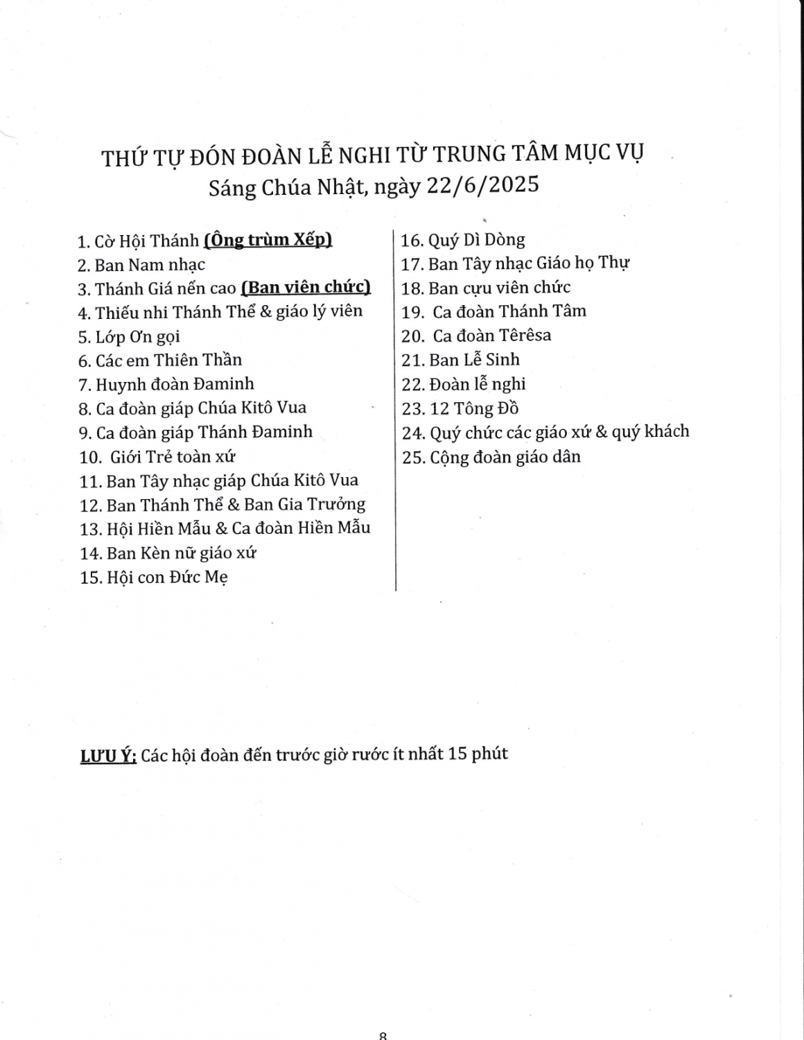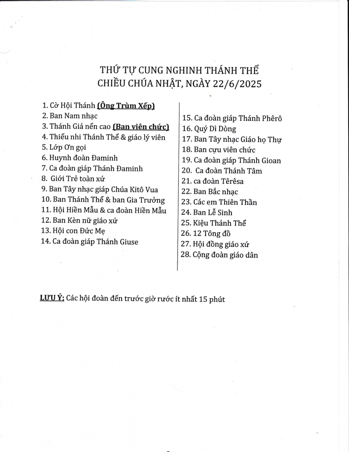 Trong suốt tuần Chầu Thánh Thể, các Giáo họ, giáo Giáp và các đoàn hội xưng tội rước lễ, tham dự Thánh Lễ, hành hương tại Đền Thánh, luân phiên Chầu Chúa Giêsu Thánh Thể để lãnh ơn toàn xá được hưởng cách hữu hiệu trong năm thánh Hy Vọng 2025.