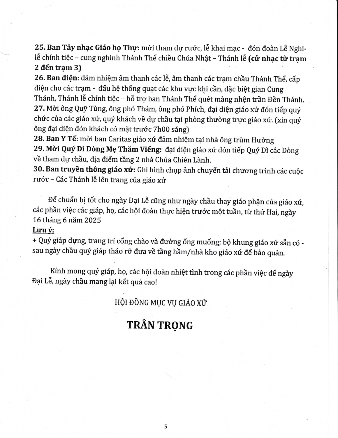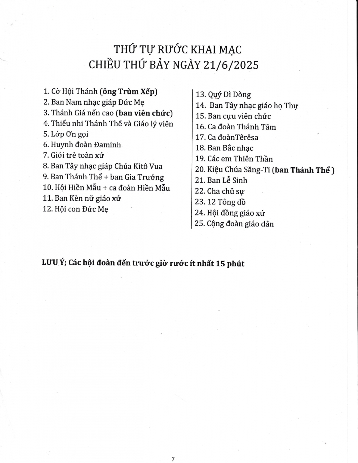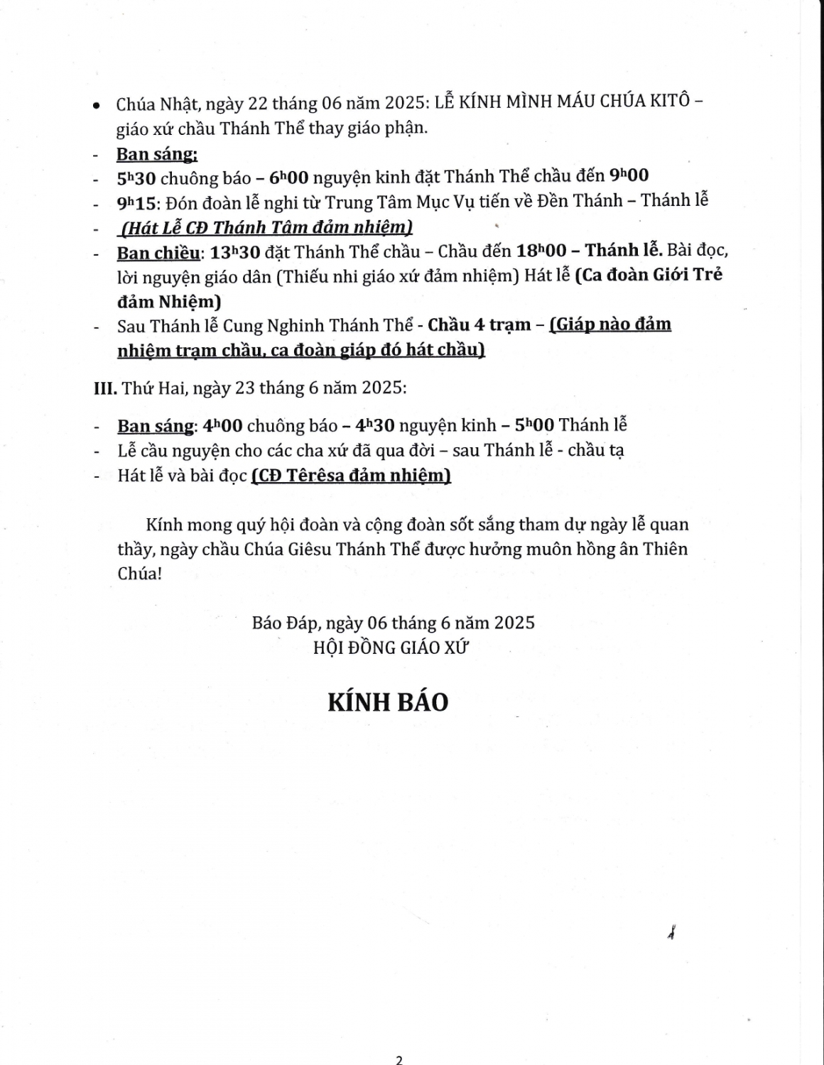 Trong suốt tuần Chầu Thánh Thể, các Giáo họ, giáo Giáp và các đoàn hội xưng tội rước lễ, tham dự Thánh Lễ, hành hương tại Đền Thánh, luân phiên Chầu Chúa Giêsu Thánh Thể để lãnh ơn toàn xá được hưởng cách hữu hiệu trong năm thánh Hy Vọng 2025.