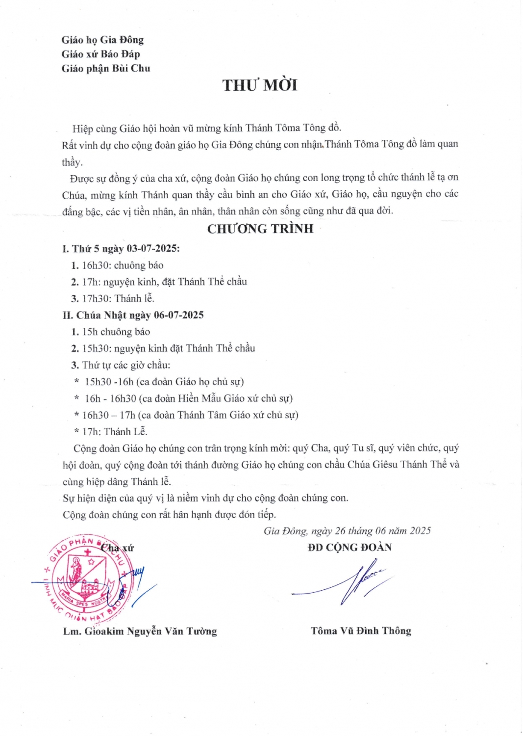 Thư mời: Giáo họ Gia Đông mừng Lễ Thánh Tôma Tông Đồ 2025