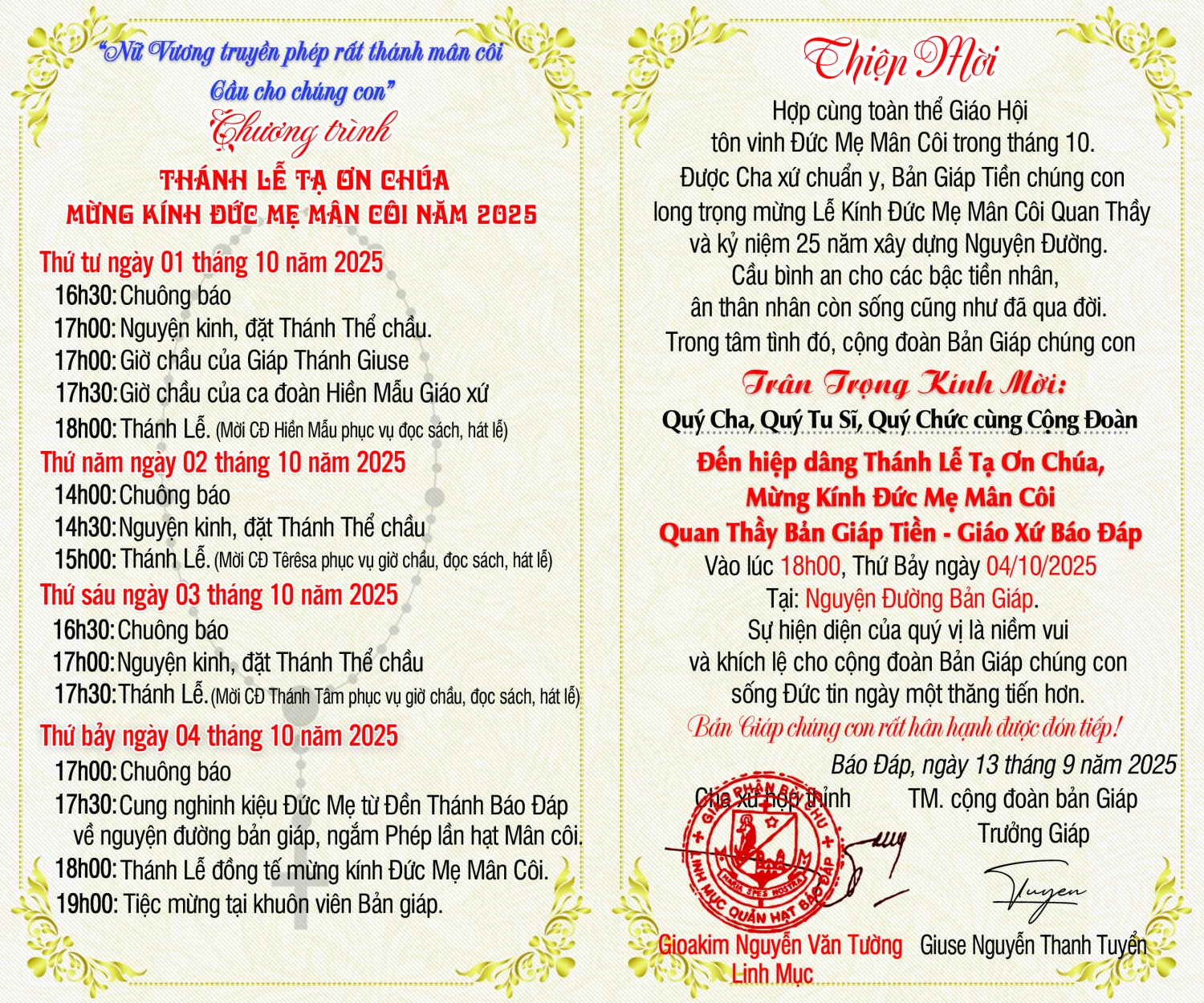 Thiệp mời: Bản Giáp Tiền - Giáo xứ Đền Thánh Báo Đáp mừng Quan Thầy & kỉ niệm 25 năm xây dựng Nguyện Đường