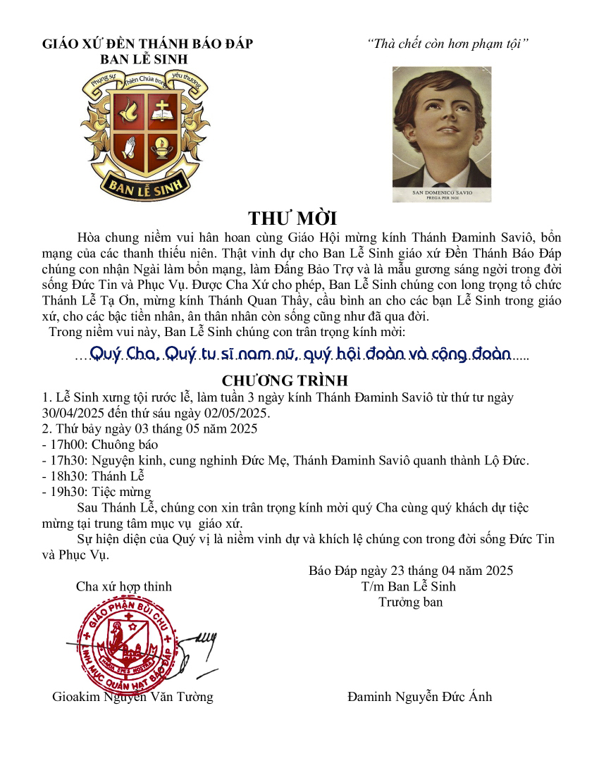 Hòa chung niềm vui hân hoan cùng Giáo Hội mừng kính Thánh Đaminh Saviô, bổn mạng của các thanh thiếu niên. Thật vinh dự cho Ban Lễ Sinh giáo xứ Đền Thánh Báo Đáp nhận Ngài làm bổn mạng, làm Đấng Bảo Trợ và là mẫu gương sáng ngời trong đời sống Đức Tin và Phục Vụ. Được Cha Xứ cho phép, Ban Lễ Sinh long trọng tổ chức Thánh Lễ Tạ Ơn, mừng kính Thánh Quan Thầy, cầu bình an cho các bạn Lễ Sinh trong giáo xứ, cho các bậc tiền nhân, ân thân nhân còn sống cũng như đã qua đời.