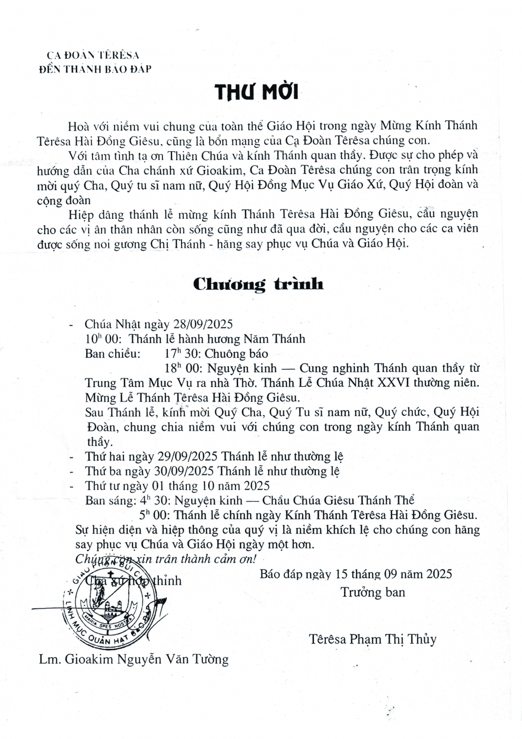 Với tâm tình tạ ơn Thiên Chúa và kính Thánh quan thầy. Được sự cho phép và hướng dẫn của cha xứ, Ca Đoàn Têrêsa trân trọng kính mời quý cha, quý tu sĩ nam nữ, quý Hội Đồng Mục Vụ Giáo xứ, Quý hội đoàn và cộng đoàn hiệp dâng Thánh Lễ quan Thầy vào 18h00, Chúa Nhật ngày 28.09.2025.