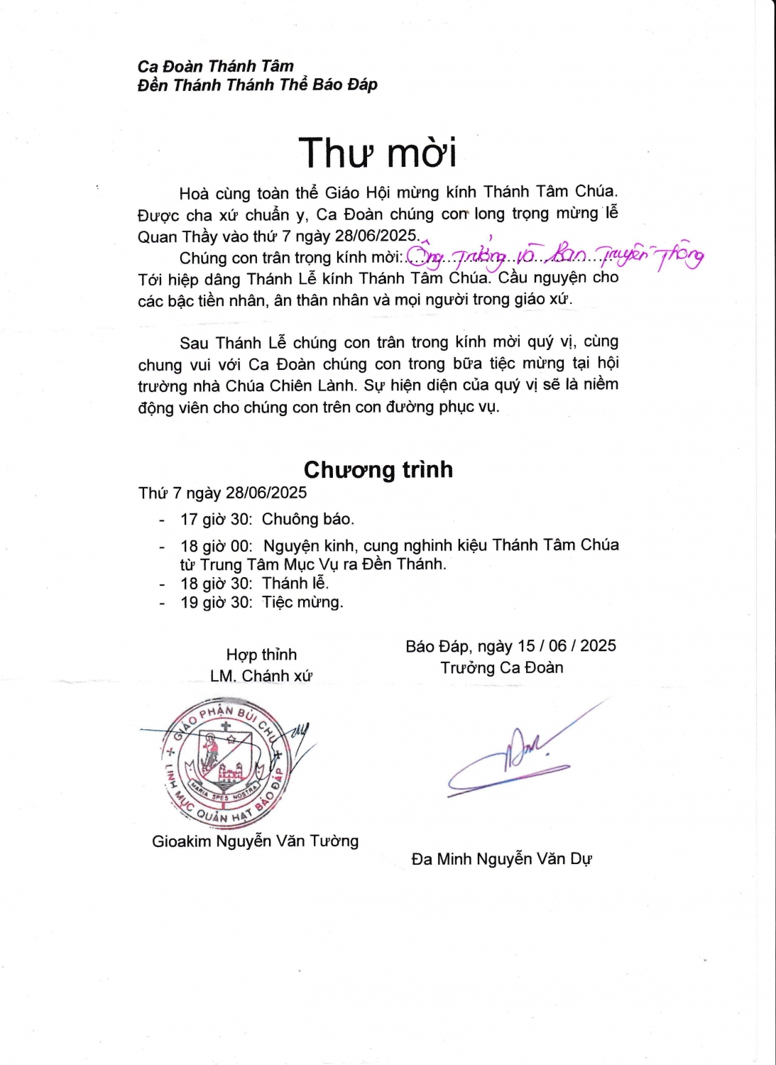 Thư mời: Ca đoàn Thánh Tâm mừng quan thầy