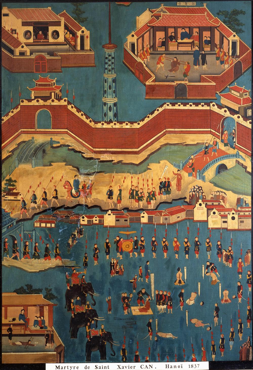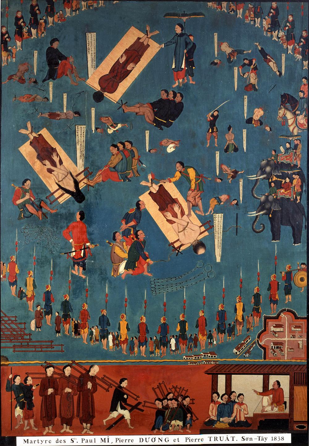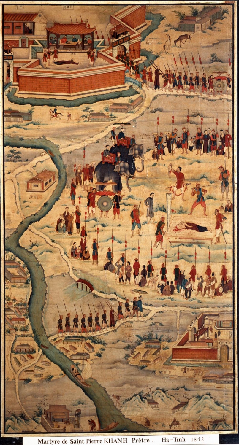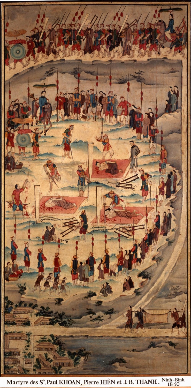 [67] Launay Andrien, Les Cinquante-deux serviteurs de Dieu, tome II, éditions de Téqui, Paris 1893, tr. 131: “Voilà donc comment se font ici les martyrs: un imposant cortège de mandarins sur leurs éléphants et de soldats sous les armes, un grand concours de spectateurs de tout genre, et au milieu de cet appareil, un jeune apôtre, le cœur enflammé d’amour, les mains liées derrière le dos, les yeux élevés vers le ciel où il lui tarde de s’élancer; un prêtre françcais d’une instruction brillante, d’une haute vertu, à genoux sur la terre et près de lui le bourreau qui brandit son sarbre pour lui trancher la tête ! Oui, Messieurs, voilà comment se font ici les martyrs. Peut-être les connaisseurs trouveront-ils ce tableau peu conforme aux règles de l’art, car il est l’œuvre d’un artiste qui n’a jamais étudié la peinture ni dans les livres ni à l’ecole d’aucun maître. Mais peu vous importera la beauté du travail; c’est le sujet en lui-même qui fixera votre pieuse curiosité: vous apprécierez aussi l’intention de celui qui vous l’envoie, comme un faible témoignage de reconnaissance, pour l’intérêt que vous avez toujours porté à sa mission.”