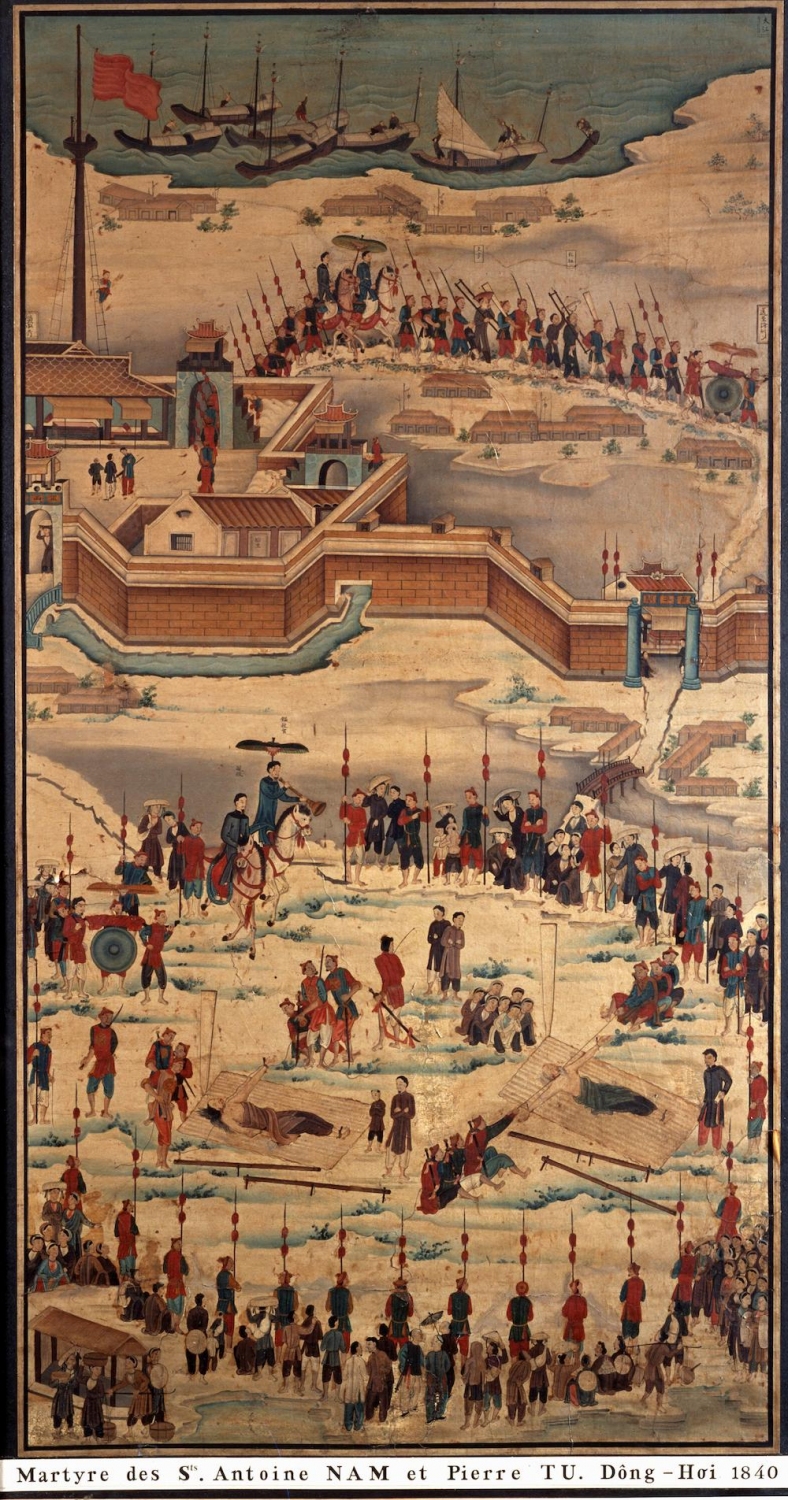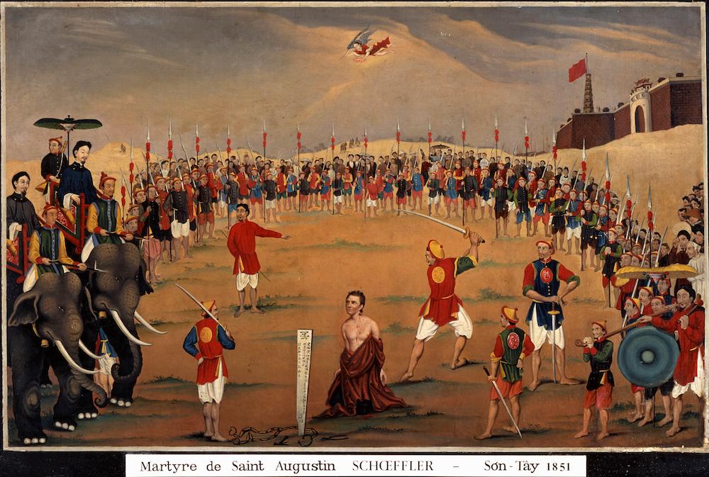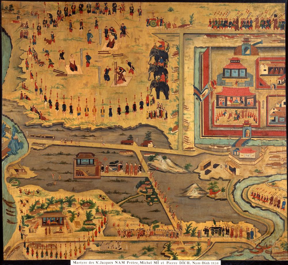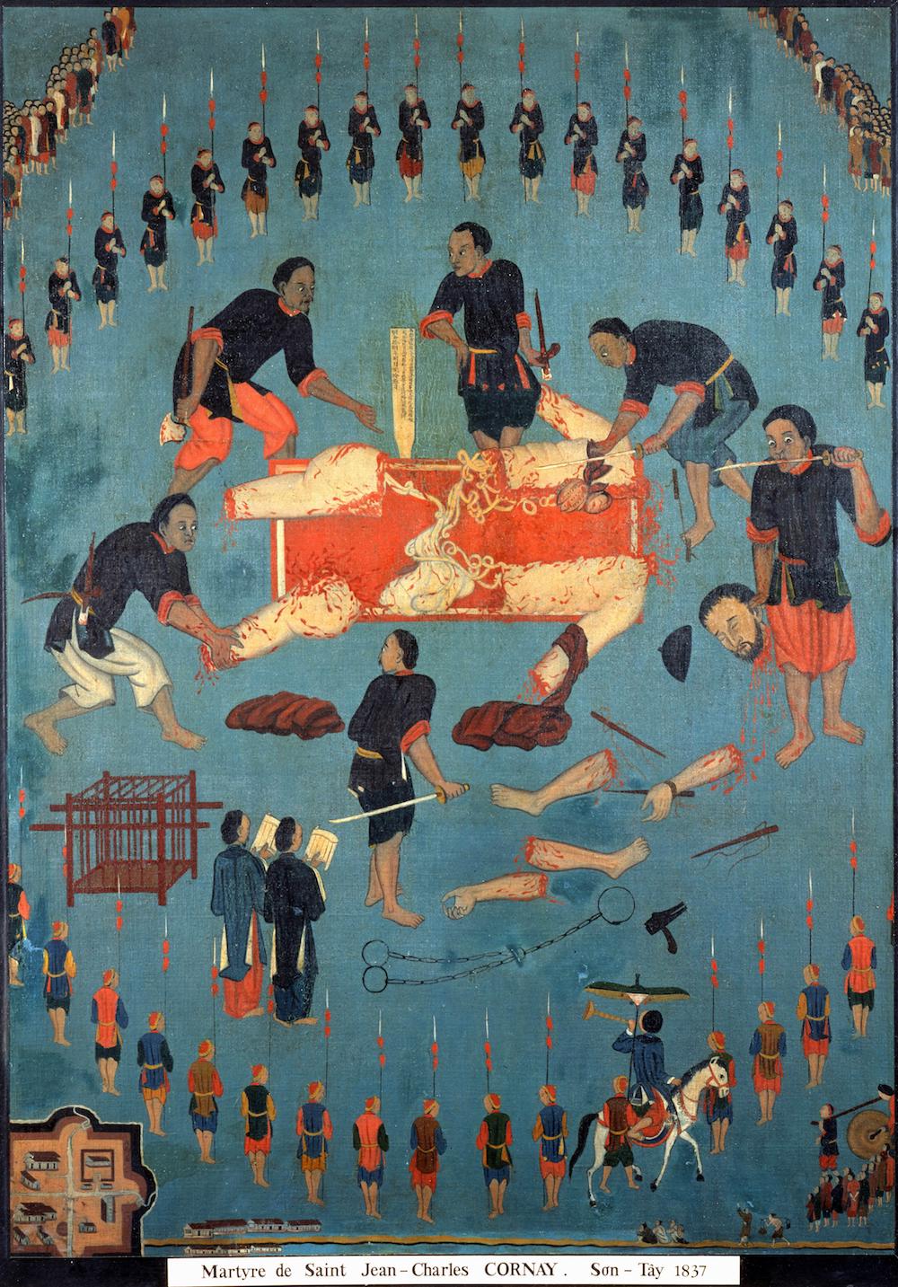 [67] Launay Andrien, Les Cinquante-deux serviteurs de Dieu, tome II, éditions de Téqui, Paris 1893, tr. 131: “Voilà donc comment se font ici les martyrs: un imposant cortège de mandarins sur leurs éléphants et de soldats sous les armes, un grand concours de spectateurs de tout genre, et au milieu de cet appareil, un jeune apôtre, le cœur enflammé d’amour, les mains liées derrière le dos, les yeux élevés vers le ciel où il lui tarde de s’élancer; un prêtre françcais d’une instruction brillante, d’une haute vertu, à genoux sur la terre et près de lui le bourreau qui brandit son sarbre pour lui trancher la tête ! Oui, Messieurs, voilà comment se font ici les martyrs. Peut-être les connaisseurs trouveront-ils ce tableau peu conforme aux règles de l’art, car il est l’œuvre d’un artiste qui n’a jamais étudié la peinture ni dans les livres ni à l’ecole d’aucun maître. Mais peu vous importera la beauté du travail; c’est le sujet en lui-même qui fixera votre pieuse curiosité: vous apprécierez aussi l’intention de celui qui vous l’envoie, comme un faible témoignage de reconnaissance, pour l’intérêt que vous avez toujours porté à sa mission.”