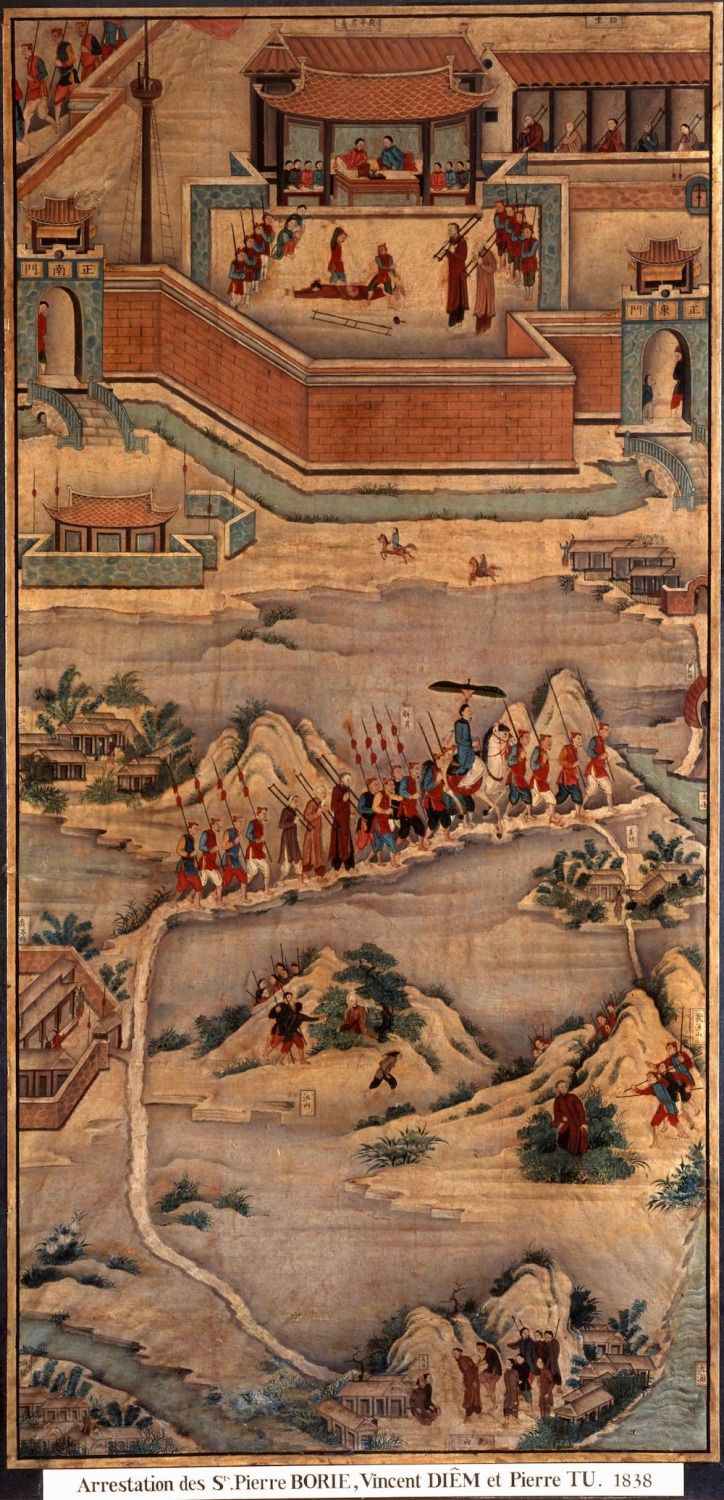 Lùng sục và bắt bớ: Phía dưới bức họa là hình ảnh vài ngôi làng, có những nhóm quân lính và hai người đang quì. Nơi vài ngôi nhà ở góc trái, phía dưới, có chữ “Cồn Giờ”[26]. Ở phía dưới của vài ngôi nhà có mấy người đứng và quì có hai chữ “Lệ Sơn”. Hai chữ phía trên đầu hai người đang quì là “oa gia”[27]. Phía dưới, góc phải là hai chữ “đại hải”. Chúng tôi xin mạo muội giải thích thêm ở đây. Năm 1838, vua Minh Mạng ra lệnh lùng bắt cha Candalh Kim, giám đốc chủng viện Di Loan. Ngày 02-07 năm đó, quân lính bắt được cha Khoa và hai thầy giảng Đức và Khang. Khi bị tra tấn, thầy Khang đã khai rằng có một thừa sai Âu Châu ở vùng Bố Chính. Quân lính lập tức đi bố ráp vùng này, đặc biệt vùng ven biển. Ngày 27-7, họ tìm được một số đồ vật của cha Vinhsơn Nguyễn Thế Điểm và bắt đầu tra khảo chủ nhà. Sáng hôm sau, một người tên là Yên đã đồng ý dẫn quân lính đến nơi cha Điểm ẩn trốn, nơi các đụn cát gần làng Đan Sa[28]. Trong bức họa, cha Điểm đầu tóc bạc phơ – lúc đó ngài đã 74 tuổi – ngồi trong một lùm cây, bên cạnh có nải chuối. Quân lính cầm gậy, một đám đang núp, hai tên tiến về phía cha Điểm, gần đó là một người đang chạy, phía dưới có hai chữ “Sa Sơn”. Bắt được cha Điểm, quan quân chưa hài lòng và họ quyết tâm lùng sục để tìm ra vị thừa sai Âu Châu. Trên đường truy tìm, họ bắt được một tín hữu tên là Thanh và nạt nộ anh. Anh này khai ra là có nhìn thấy một người vóc dáng rất lớn ở gần bờ biển. Quan quân tiếp tục lùng sục suốt đêm đó. Khi cha Borie Cao, lúc đó đang trốn trong một bụi cây, nghe tiếng quan quân tới gần, ngài biết đã bị lộ nên ra nộp mình. Giữa đêm tối, quan quân thấy một người cao lớn tiến ra nên hoảng sợ. Một tên lính ra lệnh cho vị thừa sai quì xuống. Tuy nhiên, để trấn át nỗi sợ, hắn vẫn vung gậy đánh vào lưng ngài. Đó là chuyện diễn ra sáng ngày 31-07-1838. Trong bức họa, quân lính cầm gậy đang từ nhiều hướng tiến về phía cha Borie Cao, một tên đang vung gậy. Phía sau mấy tên lính là những chữ “Trường Sa Sơn”.