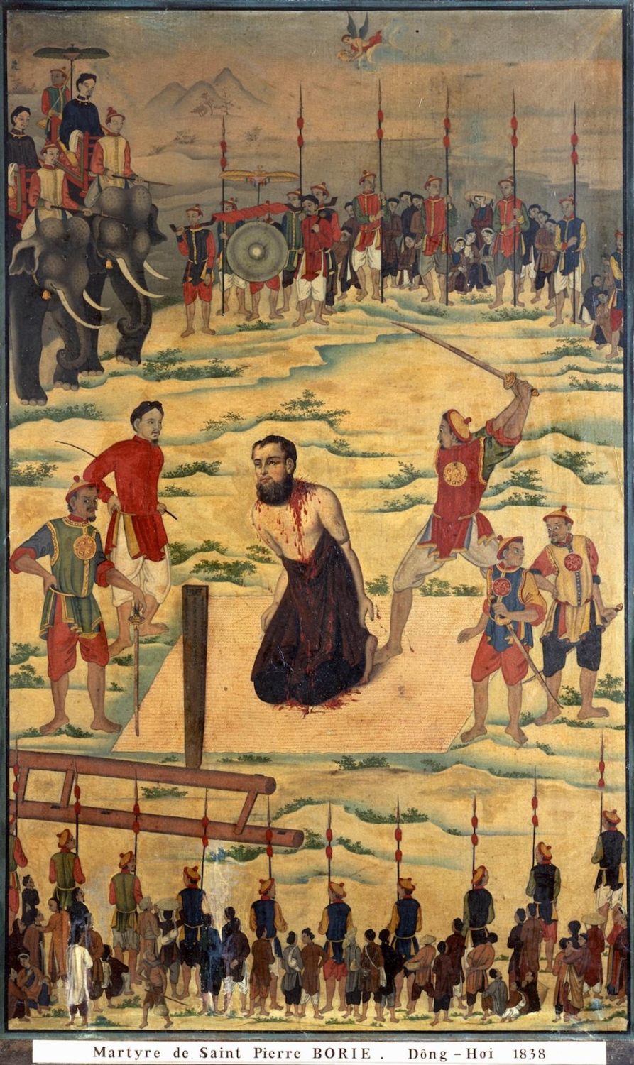 Bức họa tả cảnh pháp trường với những chi tiết giống như trong đa số các bức họa khác. Một đội quân cầm giáo đứng vòng quanh pháp trường. Hai viên quan cưỡi voi chủ trì cuộc hành quyết. Bên ngoài vòng vây quân lính, dân chúng đứng xem khá đông. Ở trung tâm bức họa, Đức cha Borie Cao đang quì trên một manh chiếu, hai tay bị trói về phía sau, áo bị lột trễ xuống tới bên trên thắt lưng[41]. Xung quanh Đức cha Borie Cao có năm người khác: viên trưởng toán đao phủ mặc áo đỏ đứng cắp roi, một viên đao phủ đứng chống gươm, viên đao phủ đang vung gươm và cạnh đó là hai viên đao phủ khác. Bức họa cho thấy máu chảy lênh láng trên cổ, chảy xuống áo Đức cha Borie Cao và xuống manh chiếu. Thực ra, họa sĩ đã không thể tả hết những điều đã xảy ra. Chúng tôi xin trích dịch lại một đoạn trong cuốn La salle des Martyrs du séminaire des Missions-étrangères, do Hội MEP ấn hành năm 1865: “… Tên lính được lệnh chém đầu ngài đã uống say để bớt sợ hãi, đến nỗi tay anh ta bị run rẩy nên chém không trúng. Nhát chém thứ nhất trúng tai và theo đà trượt xuống hàm dưới rồi làm vỡ hàm. Nhát chém thứ hai hớt đi phần bả vai và ngoặt vào cổ. Nhát chém thứ ba khá hơn, nhưng chưa thể làm đầu rơi xuống đất. Thấy cảnh này, viên quan án sát[42] hoảng sợ lùi lại. Phải tới nhát chém thứ bảy, màn trình diễn đẫm máu này với hoàn tất, nhưng chỉ sau khi vị tử đạo đã ngã xuống, các viên đao phủ mới cắt đầu ngài lìa khỏi thân.”[43]